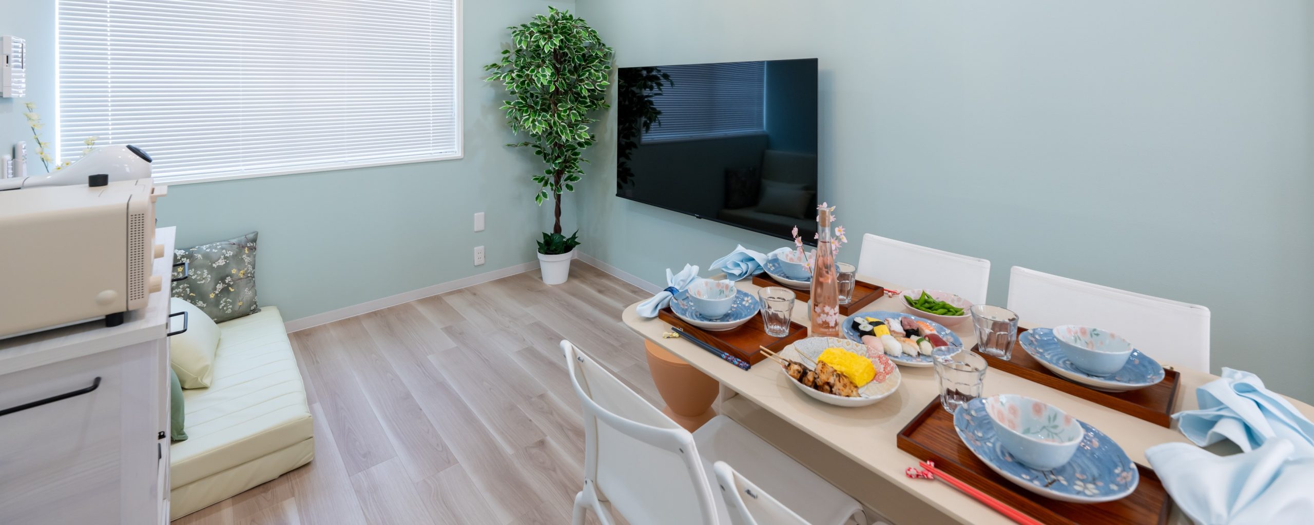 パステルカラーの色合いが優しいくつろぎ空間。